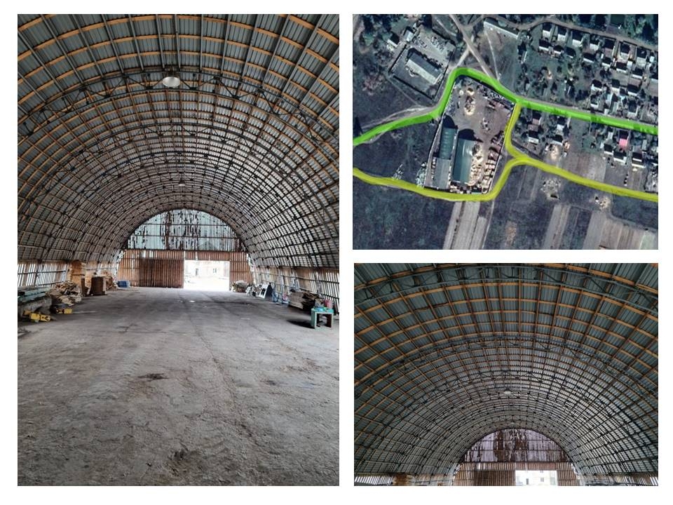 - цех загальної площею 648,6 м кв (h 5,25 м, ширина 18,41 м, довжина 36,53 м) + навіс (h 9,0 м, ширина 18,41 м, довжина 41,35 м);